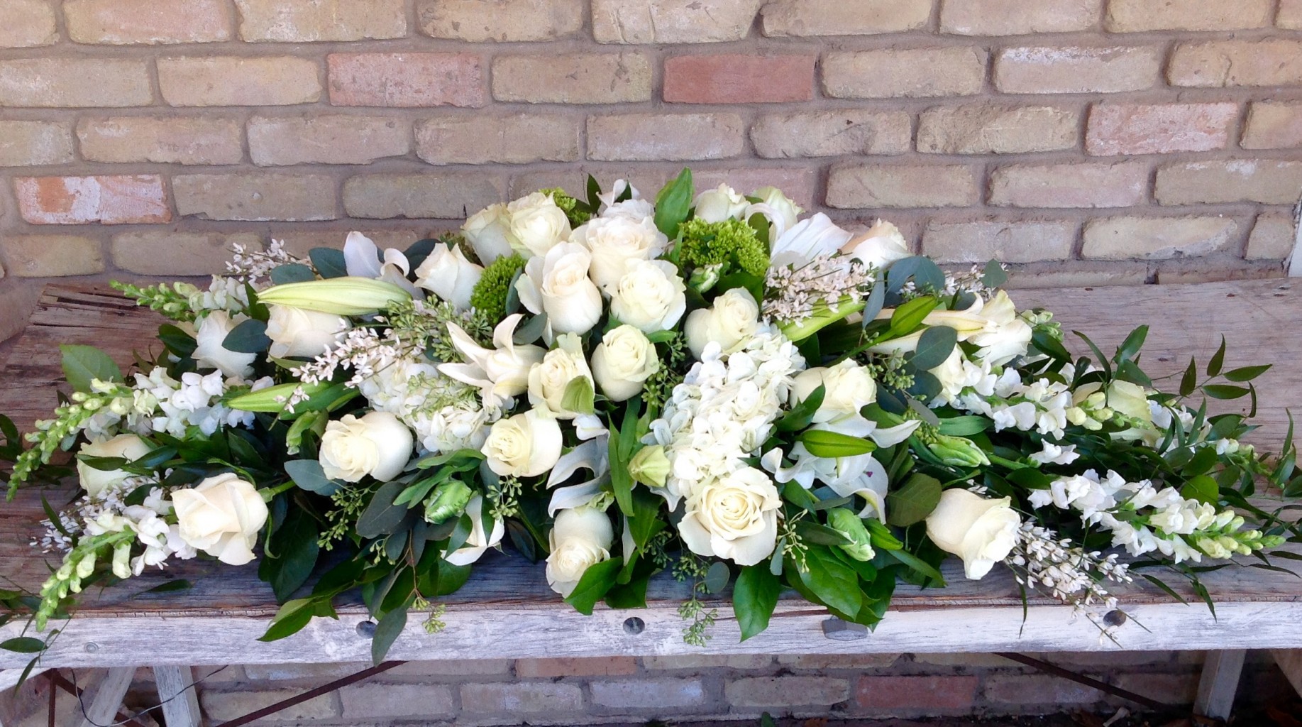 Beautiful casket flowers from the season's best blooms in honor of your loved one...shown in white. Call for specific colors or blooms