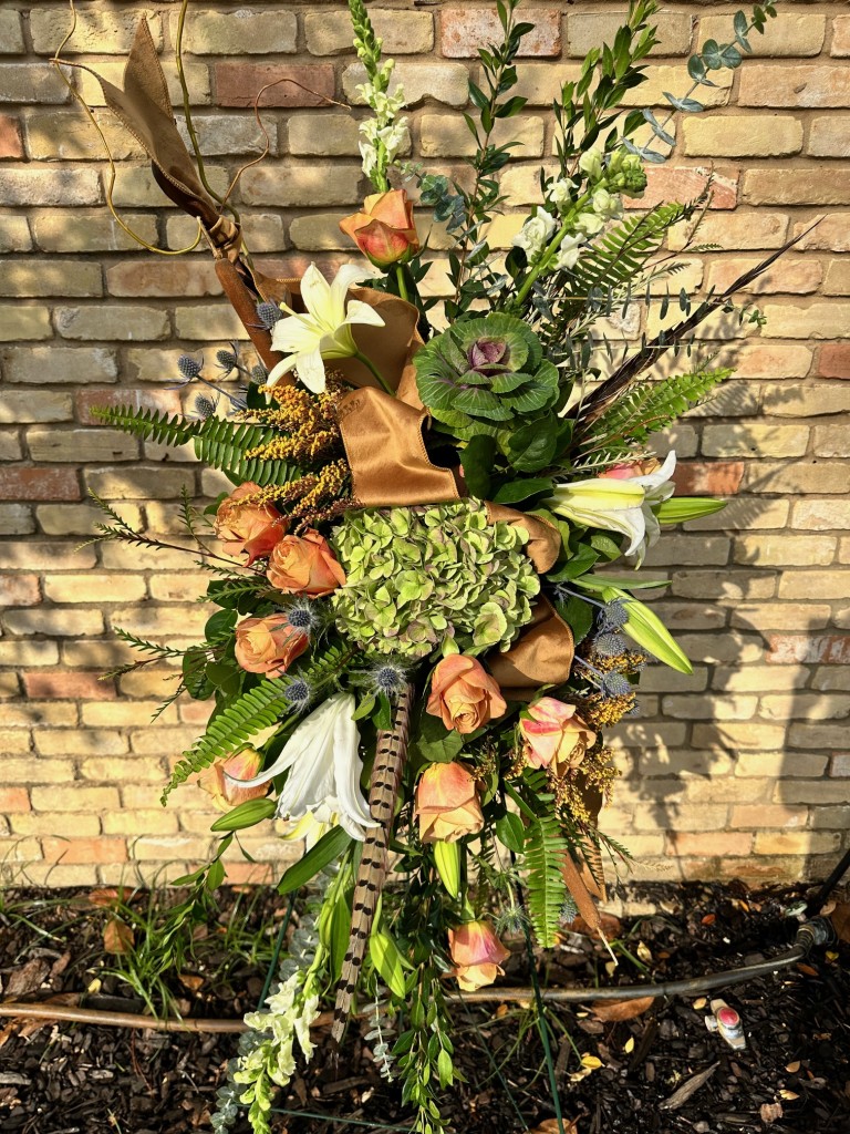 Beautiful fall colored roses, antique hydrangeas, lilies and feathers. A great combination to honor your loved one.