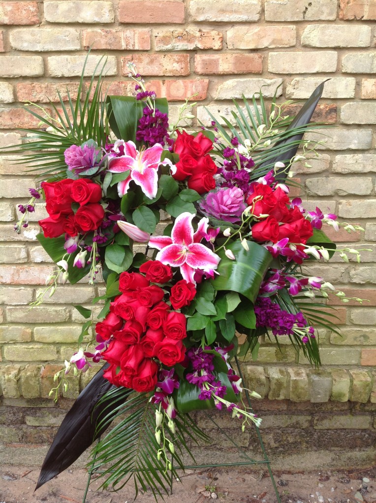 Exquisite presentation of premium roses, lilies, and exotic blooms...such a beautiful tribute. Call to request other color options.