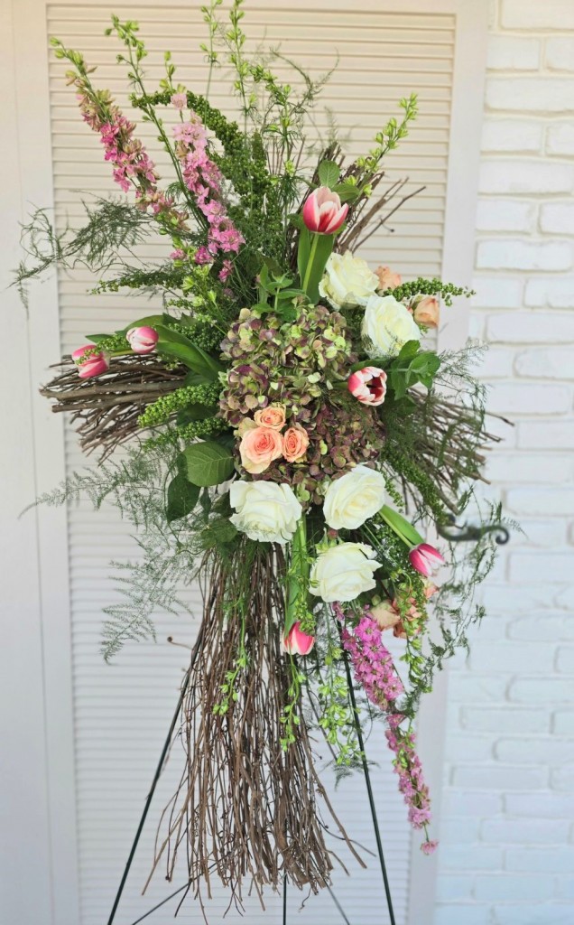 Beautiful blooms on a grapevine cross easel. The perfect touch to help celebrate your loved ones
