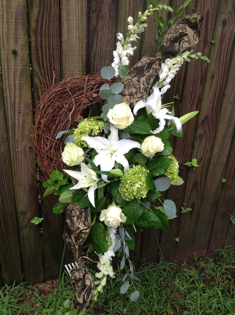 Grapevine wreath with a beautiful showing of fresh flowers, presented on an easel... shown in white. Also available in other color palettes.