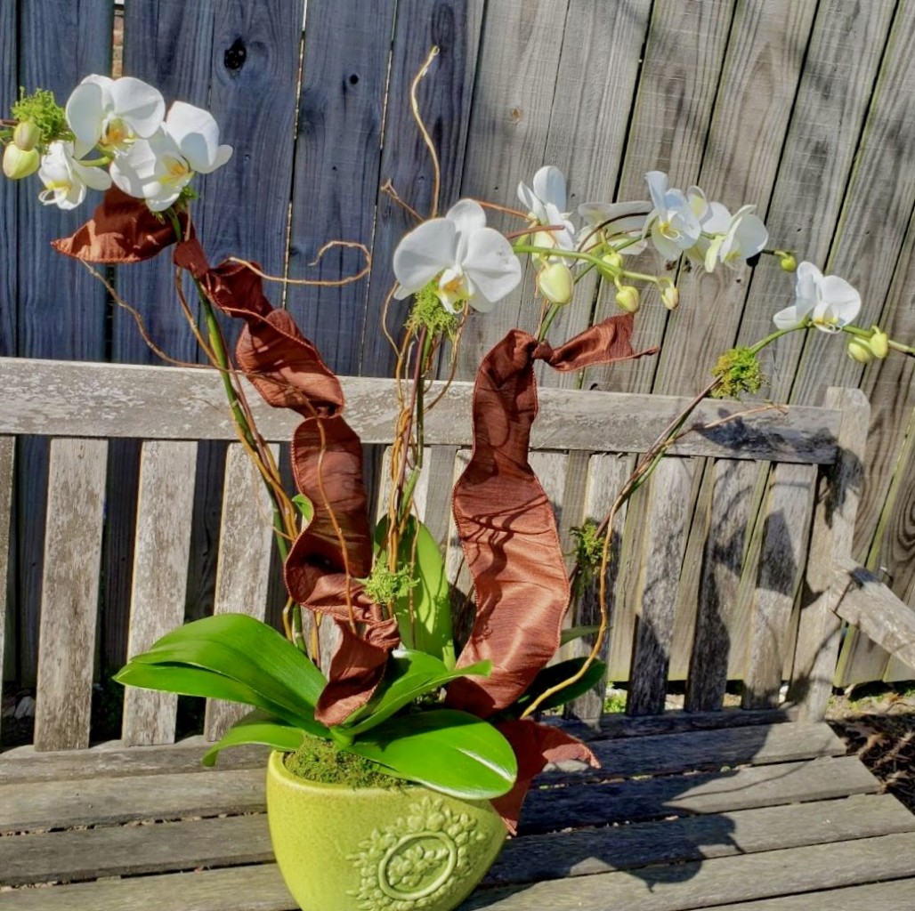 Two beautiful orchid plants in a distinctive container, completed with French Peas’ ribbon for that finishing touch.