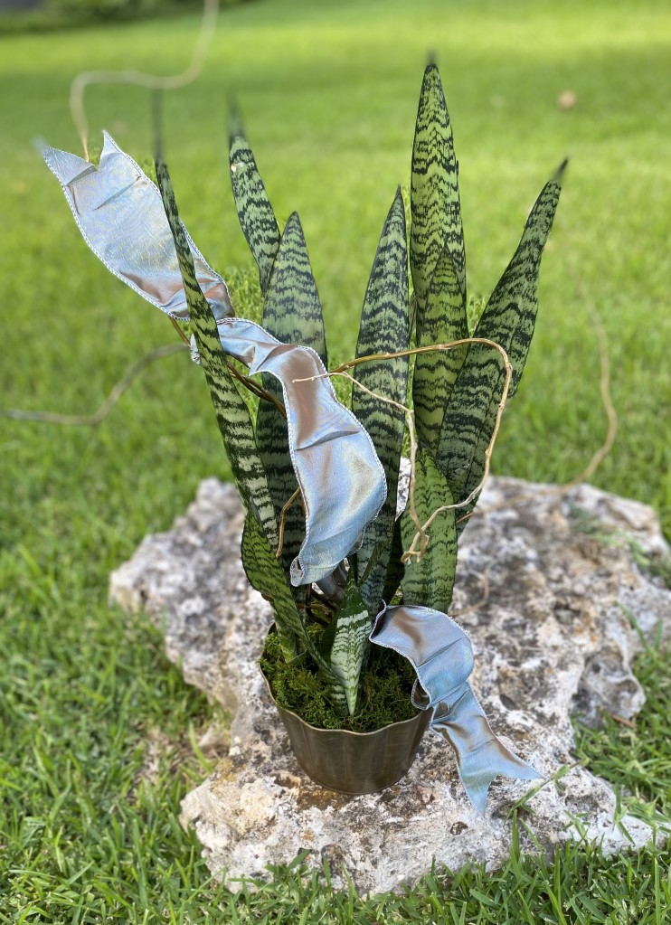 Sansevieria, also known as snake plant, is one of the easiest plants to grow. Shown in a decorative container, creatively branched and finished with French Peas' ribbon.... such a great gift!