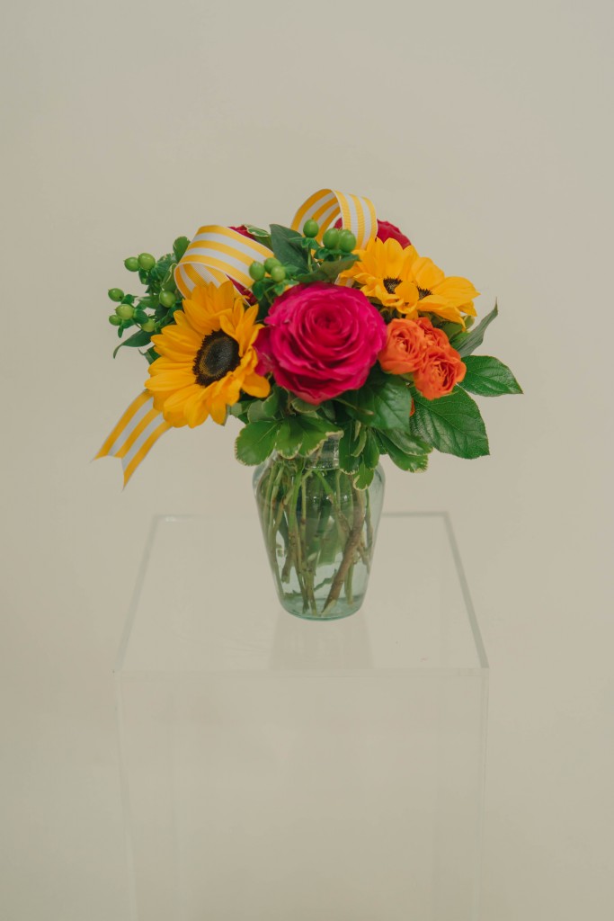 Bright sunflowers and choice roses, with a signature French Peas' bow... such a cheery combination!